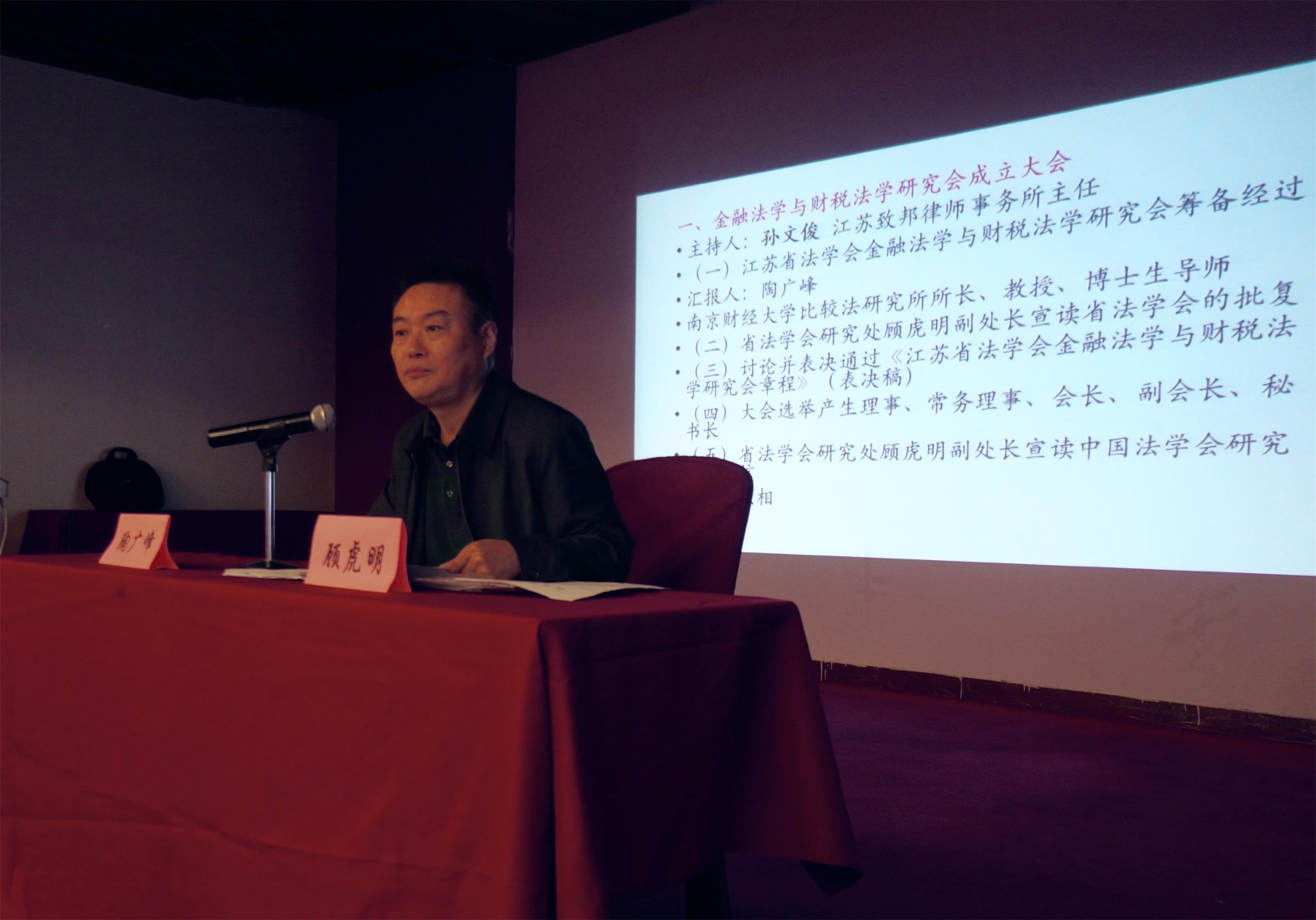 会议首先由江苏致邦律师事务所孙文俊主任致欢迎词,由研究会挂靠单位南京财经大学比较法研究所所长、博士生导师陶广峰教授汇报研究会筹备经过,江苏省法学会顾虎明副处长宣读省法学会的批复并主持了研究会的选举工作。会议通过了研究会章程,并根据研究会章程选举了: