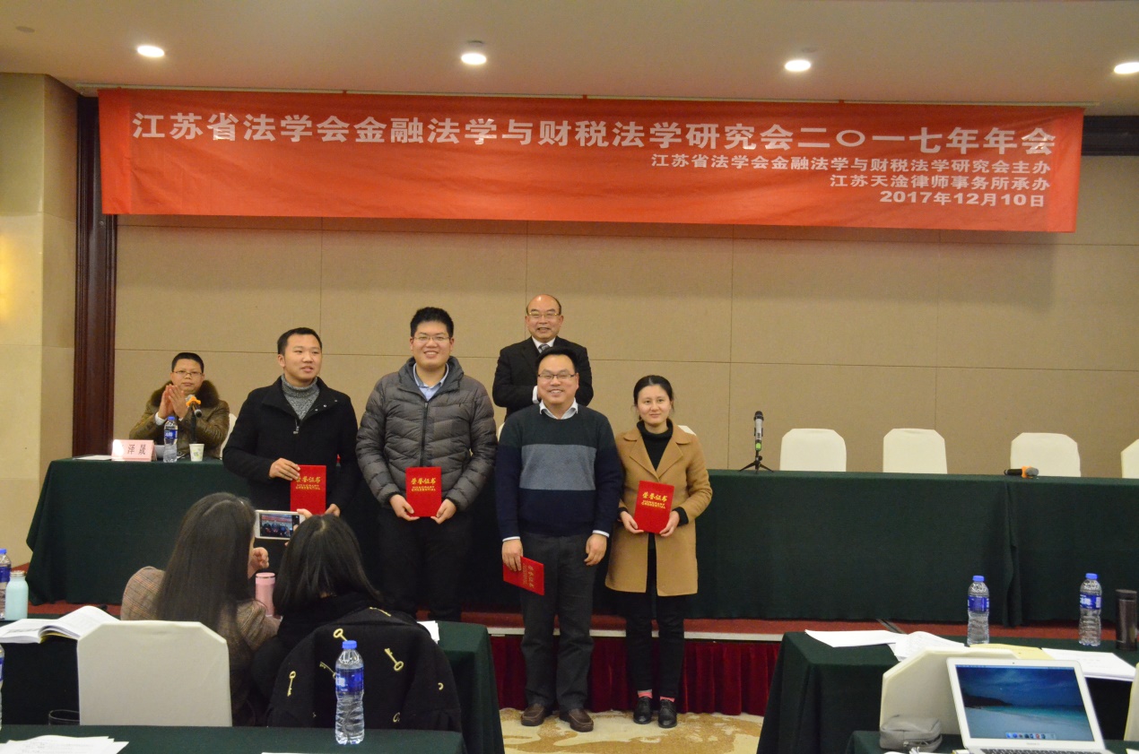 主题研讨结束后,江苏省法学会金融法学与财税法学研究会副会长肖泽晟教授宣读了对本次年会参会论文进行表彰的决定,此次年会论文共评出一等奖4名,二等奖8名,三等奖10名,并由陶广峰会长、肖泽晟副会长、姚志坚副会长、孙文俊副会长、钱智副会长为获奖论文颁奖。