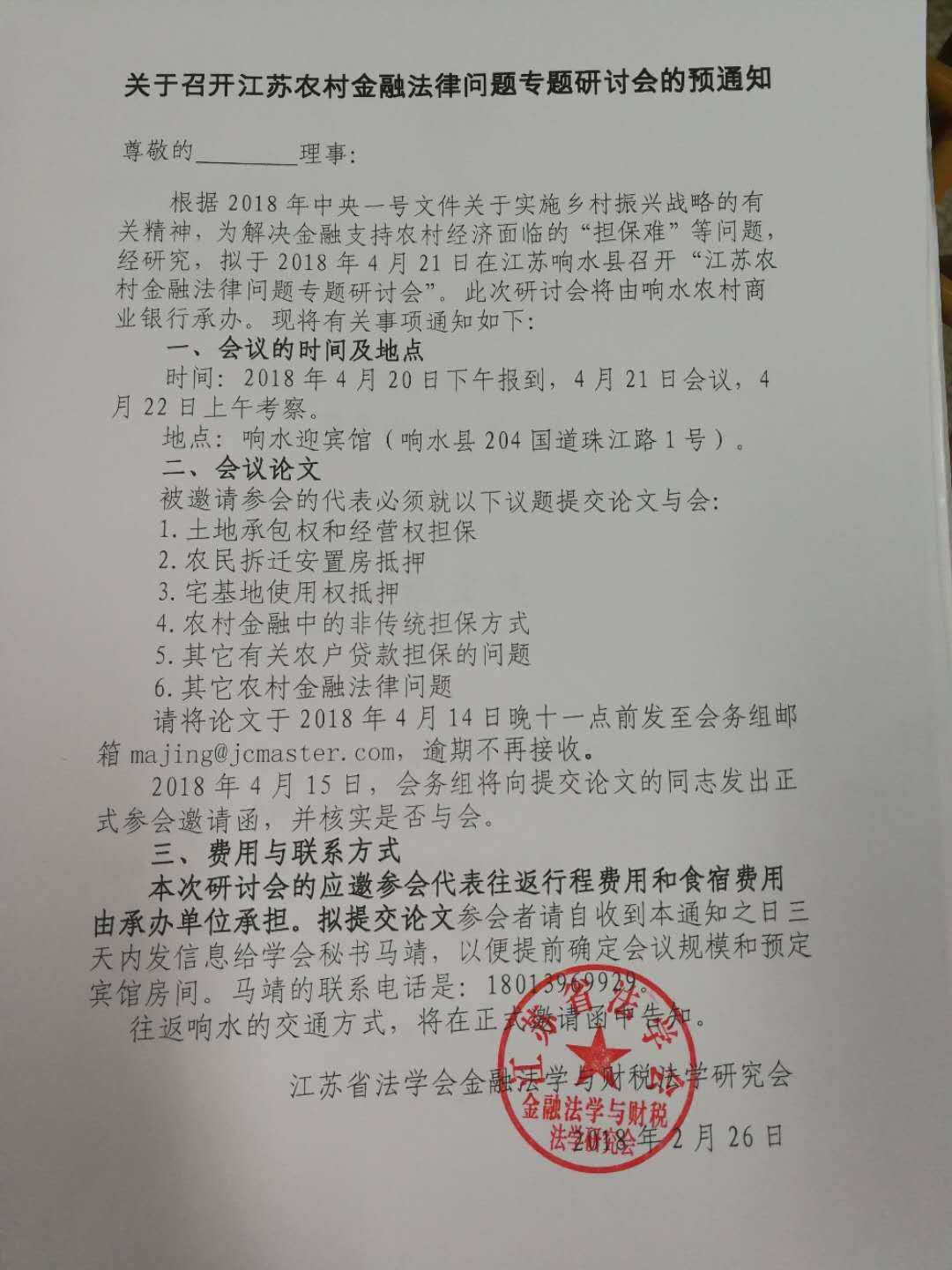 关于举办江苏农村金融法律问题专题研讨会的预通知
