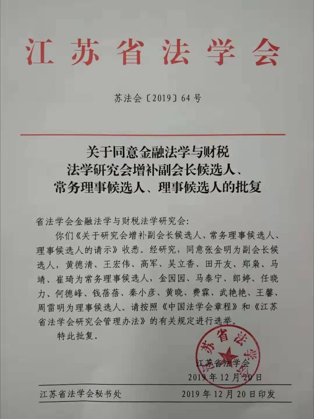 •     2019年12月29日,江苏省法学会金融法学与财税法学研究会2019年年会在南京熊猫金陵大酒店隆重举行,本次年会由江苏省法学会金融法学与财税法学研究会主办。来自全省高校、法院、检察院、税务部门、律师事务所、企业等近200名学者参加了本次年会。